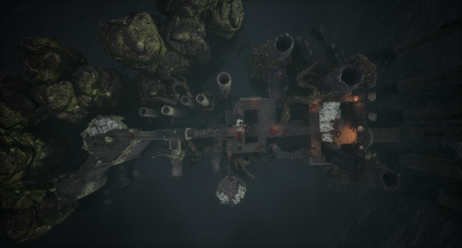 I also added blood splatter decals as a way to breadcrumb the play, leading them to my desired endpoint on the right edge of the map. The blood acts as a trail of events that have already happened, which leads the player to new points of curiosity.